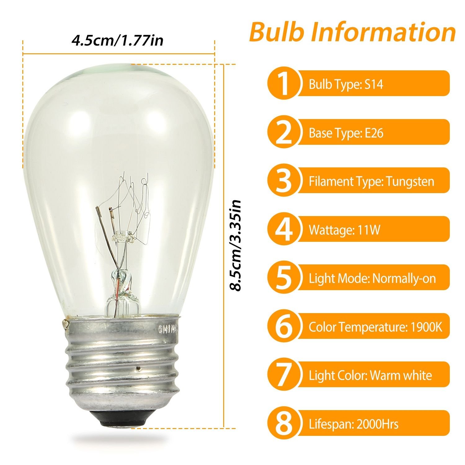 **EXCELLENT ATMOSPHERE DECORATION LIGHT*:15Pcs 11W 1900K warm white glass Tungsten filament bulbs are strung through a 48ft long cord to create a warm,cozy and relaxing atmosphere. Perfect for gathering and a romantic dinner.