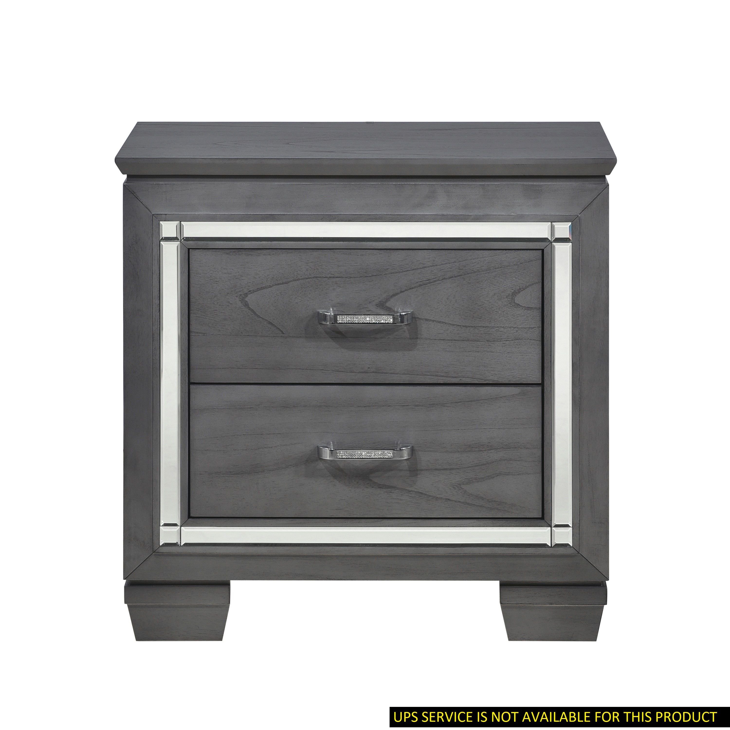 Glamour reigns in the design of the Allura Collection. Framing the nightstand is a decorative beveled mirror accent that enhances the illumination from the under-light of the nightstand. High polished crystal-enhanced hardware boldly accents the gray finish.