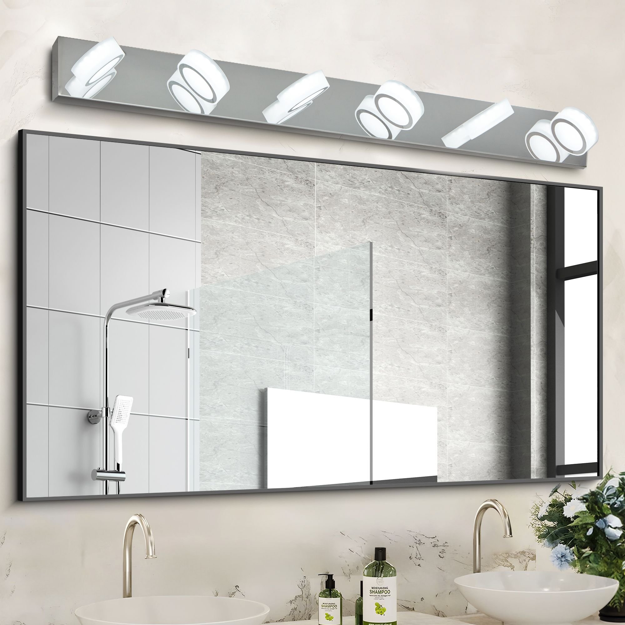LED Modern Chrome 6-Light Vanity Lights Fixtures Over Mirror Bath Wall LightingMODERN & MINIMALIST DESIGN VANITY MIRROR LIGHTS : The luxurious lights for vanity mirror design is very much in line with the modern pursuit of design indoor, the bright sconce light emitted from the stainless steel bathroom light fixtures creates a beautiful and soft mirror lighting effect, the sconces wall lighting stainless steel metal part and frosted acrylic decoration design, the bathroom vanity light is suitable for your bathroom, mirror cabinet, living room and dressing room etc.with advanced plating process and sealing technology, the chrome vanity light can be dustproof, fog-proof, put corrosion and moisture-proof in bathroom above vanity mirror as lights for mirror .
