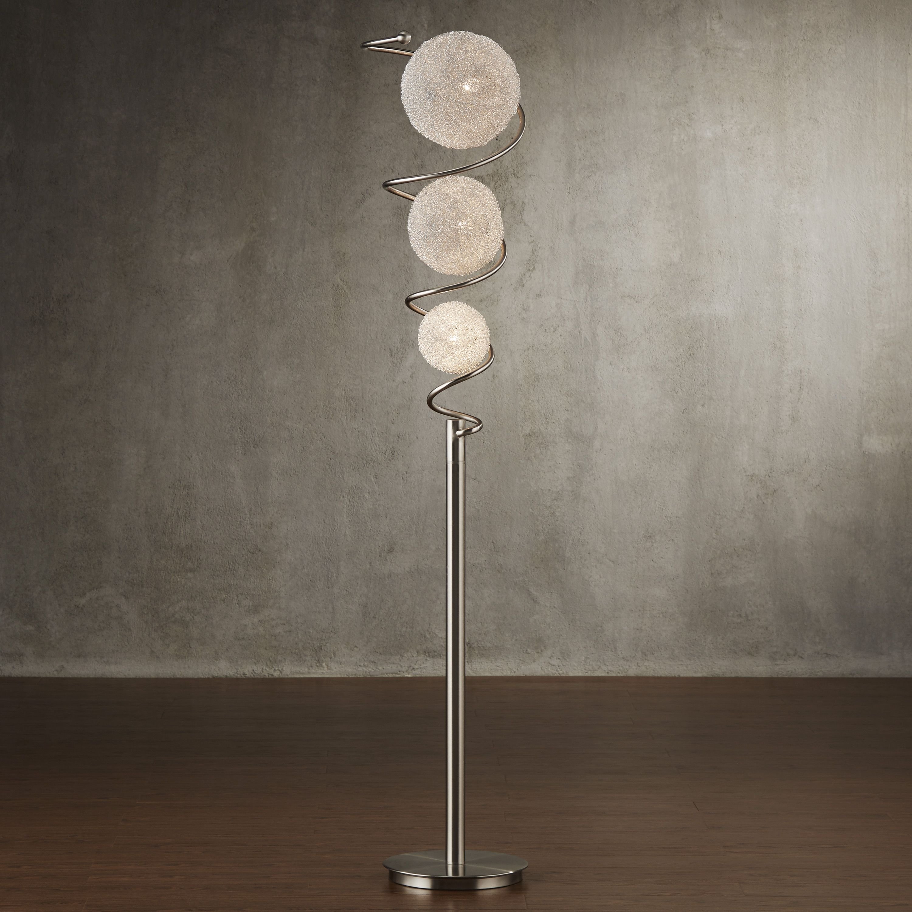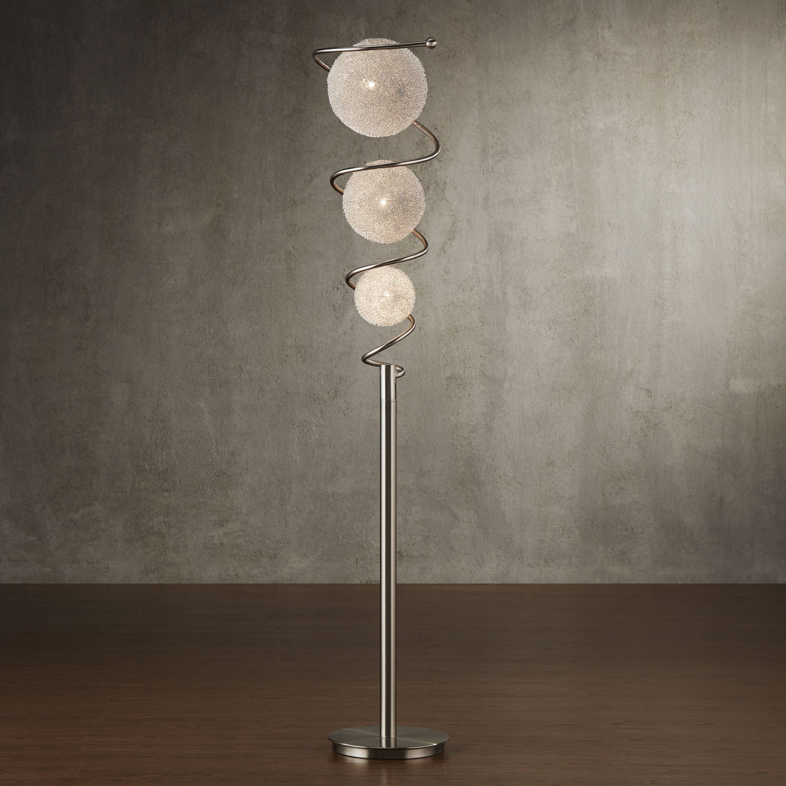 The metal saturn three orbs accent light gravity defying design features three aluminum wraped sparkling orbs suspended mid-air, illuminating warm white light rays. The piece is beautifully crafted using high quality satin nickel finish metal. Great accent lighting floor lamp that can enhance the surrounding ambiance, perfect for a night light, or a mood light to brighten up any room.PRODUCT DIMENSIONS:Overall Dimension: 13" x 12.5" x 65"HBall size: Ȼ5.5" & Ȼ7" & Ȼ9"Listing Includes: One Floor Lamp OnlyAssembly Required
