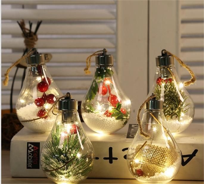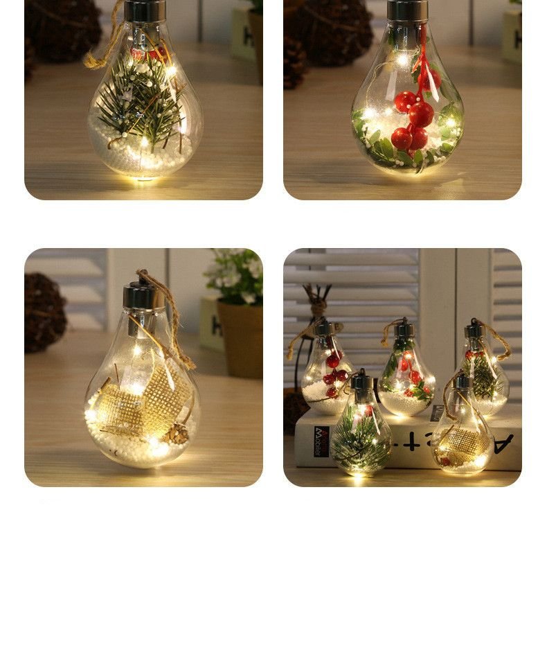 This is a LED transparent Christmas decoration ball; creative simulation light bulb Christmas tree decoration pendant plastic ball. Can be used for Christmas decoration; shopping malls; hotels; supermarkets; home and other places are very suitable.This product is a set of five LED simulation Christmas lights; each bulb built-in accessories; add a festive atmosphere; accessories are popular elements; small and exquisite style; with floral or duty; to build the form of artistic beauty; High transparent plastic material; crystal transparency; high flexibility; the overall permeability; warm light irradiation; light time is long; the built-in button battery is easy to replace; Transparent plastic Christmas ball with twine pendant; easy to hang up at any time; increase the feeling of retro; increase the sense of decoration and aesthetic degree.