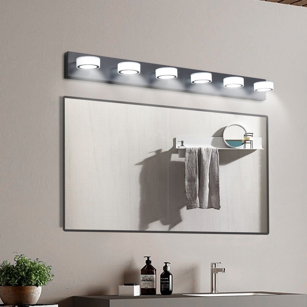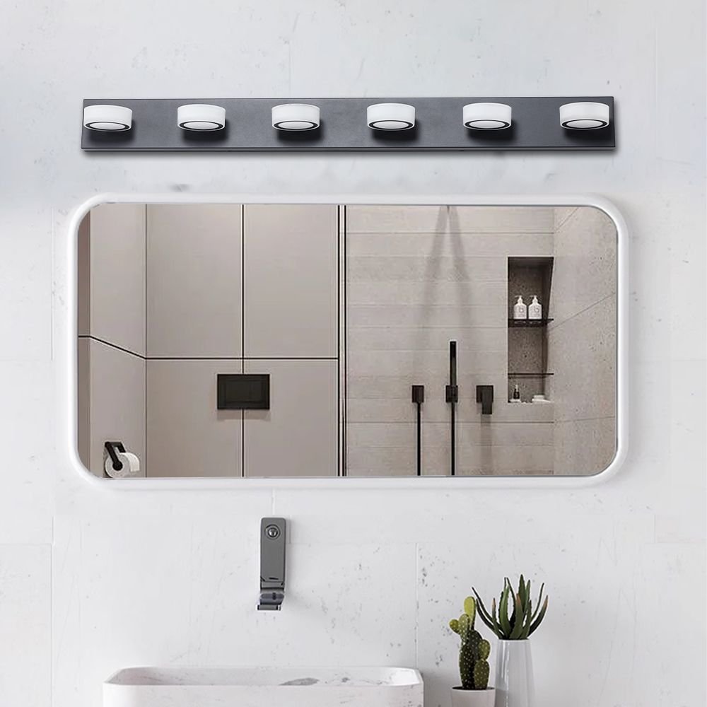 LED Modern Black 6-Light Vanity Lights Fixtures Over Mirror Bath Wall LightingMODERN & MINIMALIST DESIGN VANITY MIRROR LIGHTS : The luxurious lights for vanity mirror design is very much in line with the modern pursuit of design indoor, the bright sconce light emitted from the black bathroom light fixtures creates a beautiful and soft mirror lighting effect, the sconces wall lighting black metal part and frosted acrylic decoration design, the bathroom vanity light is suitable for your bathroom, mirror cabinet, living room and dressing room etc.with advanced plating process and sealing technology, the black vanity light can be dustproof, fog-proof, put corrosion and moisture-proof in bathroom above vanity mirror as lights for mirror .